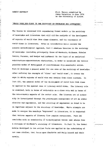 The thesis is concerned with engendering formal models in the sociology knowledge and literature that will aid the analysis of the development of aspects of world view from class elements, and the expression of world views in literature. After an introduction which reviews the general methodological approach, Part I examines theories in the sociology of knowledge (including principally those of Mannheim, Goldmann, Scheler Pareto, Parsons, and Berger and Luckmann) in the light of an analytical substructure-superstructure distinction, in order to establish the various possible modes of development of consciousness from meaningful action. Part II develops a general model for one area of the sociology of knowledge after refining the concepts of 'class' and 'world view', it traces the ways in which aspects of world view may develop from class elements. Impart III, the general model of the development of world view from classis applied to the special case of literary world views. The literary role is examined, both in terms of authorship as a class role and in terms of the non economic aspects of the author role. The literary act of authorship is investigated through the predominant conceptions of art as communication and expression, and the sociology of expression is found to be an important adjunct to the sociology of knowledge. Where attempts are made to analyse the meanings ‘expressed' in literature, it is suggested that various aspects of literary form require recognition. Part III concludes with an examination of methodological issues that emerge from a critique of Goldmann's sociology of literature. In Part IV, the formal models developed in the earlier Parts are applied to the undertaking of two case studies that focus upon Charlotte and Emily Brontë and their novels.