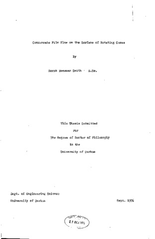 A theoretical and experimental analysis has been made of condesating flow on the outer surface of 10o and 20o included angled, truncated, rotating cones. Experiments were carried out at steam pressures of 1.5, 2, 2.5, 3 and 4 oar absolute. The rotational speed range examined was such that it was possible to follow the progress from the stage at which ridge like waves was formed to that at which drops are thrown from the crests of the ridges. The peak film thickness was measured, employing an insulated pointer and micrometer technique, and a photographic record of the condensate surface profile was obtained. The latter record provided wavelength and ridge orientation measured with reference to the cone generator line. A theoretical equation is developed from the varier-stokes equations of motion with suitable boundary conditions for predicting the behaviour of the condensate film. Given basic film temperature difference and the physical properties of the condensate film then the wavelength, minimum film thickness and wave amplitude are determined for a known heat flux. The various configuration of the ridge like waves, as both steam pressure and rotational speed were varied, are presented and discussed. The points at which ridge like waves form and droops begin to be thrown from these ridges are examined and correlation made to predict these conditions. The effect of coriolis forces concerned with centrifugal force is examined to assortain the angle which the ridge makes with the core generator as ill progresses down the surface.