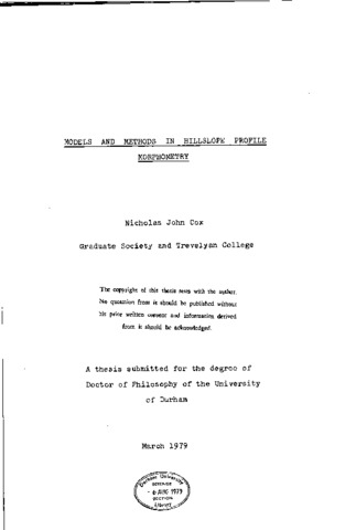 This thesis considers and evaluates mathematical models and methods of data analysis used in the quantitative study of hillslope profile form. Models of hillslope profiles are brought together in a critical and comprehensive review. Modelling approaches are classified using five dichotomies (static/dynamic, deterministic/ stochastic, phenomenological/representational, analytical/ simulation, discrete/continuous). Profile data to serve as examples were collected using a pantometer in a 100 km(^2) square centred on Bilsdale in the North York Moors. Geomorphological interpretations put forward for this area include theses of profound lithological influence, polycyclic denudation history, proglacial lake overflow channels and profound cryonival influence. Profile dimensions, profile shapes, angle and curvature frequency distributions and bedrock geology can be related via a fourfold grouping of profiles. The use of quantile-based summary measures and of a method of spatial averaging and differencing are advocated and illustrated. Autocorrelation analysis of hillslope angle series appears to be of limited geomorphological interest, as autocorrelation functions tell a story of overall profile shape, which can be measured more directly in other ways. Problems of non stationarity and estimator choice deserve greater emphasis. Methods of profile analysis previously proposed by Ahnert, Ongley, Pitty and Young are all unsatisfactory. A method based on additive error partition and nonlinear smoothing is proposed as an interim alternative, and results related to bedrock geology. An approach to model fitting is outlined which treats specification, estimation and checking in sequence. A power function due to Kirkby is used as an example and fitted to field data for components. The exercise works well if regarded as a minimum descriptive approach but much greater difficulties arise if process interpretation is attempted.