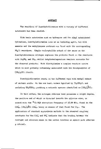 The reactions of diraethylchloramine with a variety of different substrates has been studied. With basic substrates such as hydrazine and the alkyl substituted hydrazines, dimethylchloramine acts as an oxidising agent, but with ammonia and the methylamines contrast was found with the corresponding NH(_2)Cl reactions. Simple nucleophillic attack of the amine on the diraethylchloramine nitrogen explains the products found in the reactions with CH(_3)NH(_2) and NH(_3), whilst dehydrohalegonation reaction accounts for the observed products. With dimethylamine a complex reaction occurs which is most probably intimately associated with the decomposition of (CH(_3))(_2)NCl itself. Dimethylchloramine reacts in two different ways with methyl esters of certain acids. On the one hand, esters typified by CH(_3)0S0(_2)F, and including CH(_3)0Cl0(_3), yielding a cationic species identified as (CH(_3))(_3)(^+)NCl. In this cation, the nitrogen chlorine bond possesses a slight dipole, the positive end of which is directed towards the chlorine atom, in accord with the (^36)Cl NQR absorption frequency of 56.09 MHz, found in the Cl0(^-)(_4), (CH(_3))(_3)(^+)3NCl Cl0(^-)(_4), being in excess of that found for Cl2 . The application of standard approximate methods to the observed coupling constants for the CIO4 and BP4 indicate that the bonding between the nitrogen and chlorine atoms in the cation involves an almost pure chlorine p orbital. The ion, (CH(_3))(_3)(^+)NCl, is precipitable from aqueous solutions of the chlorine trimethylaraine complex, (CH(_3))(_3)NCl(_2), by Cl0(^-)(_4) and BF(^-)(_4) ions. With the methyl halides, dimethylchloramme reacts to yield, with methyl bromide, the addition complex of trimethylaraine, (CH3)3NBrCl, the infra red spectrum of which fits well with the trends observed for other (CH3)3N (Halogen)2 addition complexes, whilst with methyl iodide, a novel tetramethylammonium pseudopolyhalide, (CH(_3))(_4)(^+)N[(CH(_3))(_2)N(ICl)(_2)](^-), forms. Dimethyl bromamine, (CH(_3))(_2)NBr, reacts in a similar way to (CH(_3))(_2)NCl, with alkylating agents, the unstable (CH(_3))(_3)(^+)NBr 0S02(_)F(^-) forms with CH(_3)0S0(_2)F and (CH(_3))(_2)NBr Cl0(^-)(_4) can be precipitated from aqueous solutions of the fluorosulphate by Cl0(^-)(_4) ions. With CH(_3)I, (CH(_3))(_2)NBr yields, in a similar way to (CH(_3))(_2)NCl, (CH(_3))(_4)(^4)N[(CH(_3))(_2)N(IBr(_2))](^-).