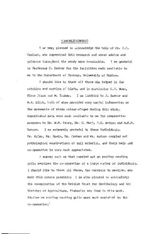 The utilisation of urban resources by the Herring Gull was studied between 1973 and 1976 in Northeast England. This involved a study of refuse tips as a winter food supply, and the use of inhabited buildings as nesting sites. The local breeding population is small, and there is an influx of gulls from east Scottish and Norwegian colonies into Northeast England during the winter months. Herring Gulls caught during winter could be sexed by bill depth alone; wing length was used as an indicator of geographical origin. Gulls fed at refuse tips in the study area throughout the winter months. There was a predominance of adults over immatures at refuse tips in winter, while immatures predominated over adults around inshore fishing vessels in the same area. There was considerable fluctuation in the number of gulls present at tips on different days, related to weather factors and feeding conditions elsewhere. Immature Herring Gulls were less constant to a particular feeding area than adults, and adult females less so than adult males. Individual Herring Gulls did not feed at refuse tips every day, and refuse did not constitute the major or necessarily the only food source for these birds in winter. There were two different feeding areas used by gulls on the refuse tips which differed in the abundance and availability of food: individual birds consistently used one or other area, and proportionally more adult females than males used the secondary area. The number of nesting pairs/ pairs and nest sites used by Herring Gulls nesting on buildings in Sunderland and South Shields were monitored. Their breeding success was higher than in more "natural" colonies, possibly due to the nature of the nesting sites. A national census of gulls nesting on buildings in Britain and Ireland was organised in 1976, to measure the growth and spread of rooftop nesting: the number of Herring Gulls nesting on buildings was found to be doubling within 5 years, and the number of Lesser Black-backs within 3 years. The potential public health hazard presented by gulls nesting on buildings was reviewed.