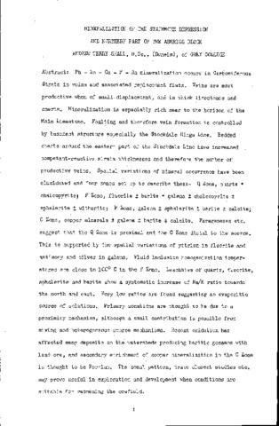 Abstract; Pb - %n - Gu - F - Ba mineralization occurs in Carboniferous Strata in veins and associated replacement flats. Veins are most productive when of small. displacement, and in thick limestones and charts. Mineralization is especially rich near to the horizon of the Main Limestone. Faulting and therefore vein formation is controlled by basement structure especially the Stockdale Hinge Line. Bedded cherts around the eastern part of the Stockdale Line have increased competant-reactive strata thicknesses and therefore the number of productive veins. Spatial variations of mineral occurrence have been elucidated and four zones set up to describe them;- Q Zone, quartz + chalcopyrite; F Zone, fluorite ± barite + galena ± chalcopyrite + sphalerite ± witherite; P Zone, galena ± sphalerite + barite ± calcite; C Zone, copper minerals ± galena ± barite ± calcite. Parageneses etc. suggest that the Q Zone is proximal and the C Zone distal to the source. This is supported by the spatial variations of yttrium in fluorite and antimony and silver in galena. Fluid inclusion homogenization temperatures are close to 100 C in the F Zone. Leachates of quartz, fluorite, sphalerite and barite show a systematic increase of Na/K ratio towards the north and east. Very low ratios are found suggesting an evaporitic source of solutions. Primary zonations are thought to be due to a proximity mechanism, although a small contribution is possible from mixing and heterogeneous source mechanisms. Recent oxidation has affected many deposits on the watersheds producing baritic gossans with lead ore, and secondary enrichment of copper mineralization in the C Zone is thought to be Permian. The zonal pattern, trace element studies etc, may prove useful in exploration and development when conditions are suitable for reopening the orefield.