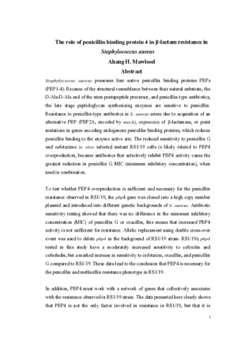 The role of penicillin binding protein 4 in β-lactam resistance in Staphylococcus aureus Ahang H. Mawlood Abstract Staphylococcus aureus possesses four native penicillin binding proteins PBPs (PBP1-4). Because of the structural resemblance between their natural substrate, the D-Ala-D-Ala end of the stem pentapeptide precursor, and penicillin-type antibiotics, the late stage peptidoglycan synthesizing enzymes are sensitive to penicillin. Resistance to penicillin-type antibiotics in S. aureus arises due to acquisition of an alternative PBP (PBP2A, encoded by mecA), expression of β-lactamase, or point mutations in genes encoding endogenous penicillin binding proteins, which reduces penicillin binding to the enzyme active site. The reduced sensitivity to penicillin G and cefotaxime in vitro selected mutant RS1/19 cells is likely related to PBP4 overproduction, because antibiotics that selectively inhibit PBP4 activity cause the greatest reduction in penicillin G MIC (minimum inhibitory concentration), when used in combination. To test whether PBP4 overproduction is sufficient and necessary for the penicillin resistance observed in RS1/19, the pbp4 gene was cloned into a high copy number plasmid and introduced into different genetic backgrounds of S. aureus. Antibiotic sensitivity testing showed that there was no difference in the minimum inhibitory concentration (MIC) of penicillin G or oxacillin, this means that increased PBP4 activity is not sufficient for resistance. Allelic replacement using double cross-over event was used to delete pbp4 in the background of RS1/19 strain. RS1/19∆ pbp4 tested in this study have a moderately increased sensitivity to cefoxitin and cefsoludin, but a marked increase in sensitivity to cefotaxim, oxacillin, and penicillin G compared to RS1/19. These data lead to the conclusion that PBP4 is necessary for the penicillin and methicillin resistance phenotype in RS1/19. In addition, PBP4 must work with a network of genes that collectively associates with the resistance observed in RS1/19 strain. The data presented here clearly shows that PBP4 is not the only factor involved in resistance in RS1/19, but that it is necessary for the full expression of resistance. It has been concluded that deletion of monofunctional trasglycosylase mgt is not essential for viability and expression of resistance in both wild-type and RS1/19strains. Future studies of RS1/19 are likely to uncover other factors that are essential for full expression of methicillin resistance in mecA negative strains of S. aureus.