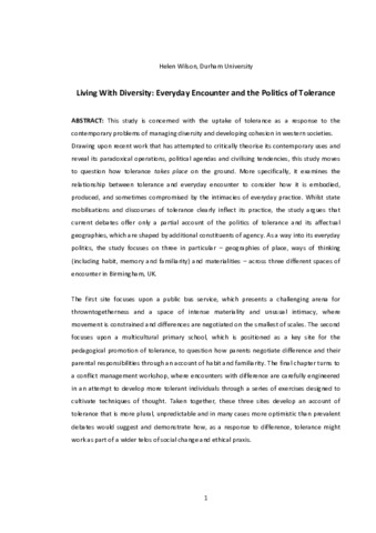ABSTRACT: This study is concerned with the uptake of tolerance as a response to the contemporary problems of managing diversity and developing cohesion in western societies. Drawing upon recent work that has attempted to critically theorise its contemporary uses and reveal its paradoxical operations, political agendas and civilising tendencies, this study moves to question how tolerance takes place on the ground. More specifically, it examines the relationship between tolerance and everyday encounter to consider how it is embodied, produced, and sometimes compromised by the intimacies of everyday practice. Whilst state mobilisations and discourses of tolerance clearly inflect its practice, the study argues that current debates offer only a partial account of the politics of tolerance and its affectual geographies, which are shaped by additional constituents of agency. As a way into its everyday politics, the study focuses on three in particular – geographies of place, ways of thinking (including habit, memory and familiarity) and materialities – across three different spaces of encounter in Birmingham, UK. The first site focuses upon a public bus service, which presents a challenging arena for throwntogetherness and a space of intense materiality and unusual intimacy, where movement is constrained and differences are negotiated on the smallest of scales. The second focuses upon a multicultural primary school, which is positioned as a key site for the pedagogical promotion of tolerance, to question how parents negotiate difference and their parental responsibilities through an account of habit and familiarity. The final chapter turns to a conflict management workshop, where encounters with difference are carefully engineered in an attempt to develop more tolerant individuals through a series of exercises designed to cultivate techniques of thought. Taken together, these three sites develop an account of tolerance that is more plural, unpredictable and in many cases more optimistic than prevalent debates would suggest and demonstrate how, as a response to difference, tolerance might work as part of a wider telos of social change and ethical praxis.