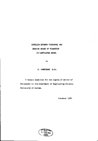 The work presented is a theoretical and experimental investigation into the effect of coupling between torsional and flexural modes of vibration in cantilever beams. Two theoretical approaches are made: firstly, a finite element idealisation in which the beam is divided into a number of elements which possess cubic variations of deflection and rotation along their lengths; and, secondly, a more analytical method in which the simultaneous differential equations of motion are solved directly by application of Laplace Transforms. The investigation is restricted to the simplest cross section which possesses a single axis of symmetry, the isosceles triangle. The exact solutions for the torsion and flexure of such sections of general shape do not as yet exist, but use is made of several approximate techniques which have been developed for this section for the calculation of the torsional stiffness and position of the centre of flexure. It is shown experimentally and theoretically that torsional oscillations do not talce place about the centre of flexure ( or centre of torsion ), but about a point which may be considered to be coincident with the centrold. It is shown theoretically and confirmed experimentally that the effect of coupling on either mode is extremely small unless the original frequencies of torsional and flexural motion are almost coincident, in which case the two frequencies are separated into coupled modes which possess both torsion al and flexural characteristics. The effect is not, however, as significant as the coupling of flexural modes due to pretwist in sections which approximate to those of turbine blades.