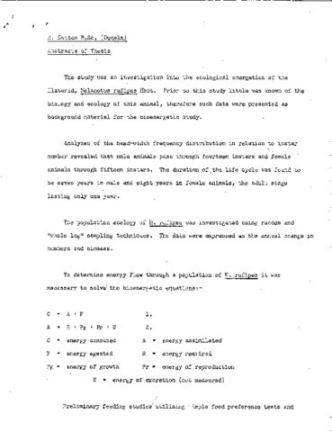 The study was an investigation into the ecological energetics of the Elaterid, Melanotus rufipes Hbst. Prior to this study little was known of the biology and ecology of this animal, therefore such data were presented as background material for the bioenergetic study. Analyses of the head-width frequency distribution in relation to instar number revealed that male animals pass through fourteen instars and female animals through fifteen instars. The duration of the life cycle was found to be seven years in male and eight years in female animals, the adult stage lasting only one year. The population ecology of M. rufipes was investigated using random and "whole log" sampling techniques. The data were expressed as the annual change in numbers and biomass. To determine energy flow through a population of M. rufipes it was necessary to solve the bioenergetlc equations:- C = A + F 1. A = R + Pg + Pr + U 2. C = energy consumed A = energy assimilated F = energy egested R = energy respired Pg = energy of growth Pr = energy of reproduction U = energy of excretion (not measured) Preliminary feeding studies utilising simple food preference tests and flame photometry techniques revealed that M. rufipes larvae have a carnivorous preference. Further feeding studies culminated in the calculation of ingestion, assimilation and faeces production rates. No evidence could be found for feeding in the adult stage. A continuously recording electrolytic respirometer and Varburg apparatus were used to measure respiratory rates. This enabled the annual respiratory metabolism of larval and adult animals, to be calculated. Monthly values of oxygen consumption per unit weight of animal produced characteristic L-shaped curves. Data were presented on the respiratory loss of each instar per unit time. Further respiratory investigations were made into the effect of size upon metabolism, the effect of feeding on the respiratory rate and the release of CO(_2) from the spiracies of H. rufipes. Additional data suggested that temperature acclimatization is not manifest as a change in respiratory rate. Growth rates were calculated from laboratory and field data and expressed in the form of a growth curve. The calorific values of whole animals, eggs, faeces and food were determined using a Phillipson microbomb calorimeter. This enabled calorific equivalents to be calculated for all parameters of the bioenergetic equations and individual energy budgets were thus prescribed for each instar and the adult stage of M. rufipes. From these data a mean energy budget ("best estimate") was calculated thus: Mean ingestion (C):-19»55 k. cals/l00 L. timber/year, assimilation (A):- 17.48 k. cals/l00 L. timber/year, egestion (F):- 1.86 k. cals/l00 L. timber/year respiration (R):- 2.74 k. cals/l00 L.timber/year and growth (Pg):-4.15 k. cals/100 L. timber/year. The assimilation percentage on a calorific basis was 90.3% (cf. 86.3% by weight). The ratio of secondary production/respiration was 28.6%.