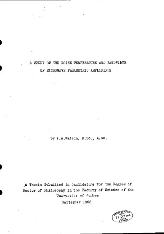 This study has arisen because of the requirement for a 4 CHz, 500 MHz bandwidth, parametric amplifier with a noise temperature of less than 20ºK, for the proposed satellite communication system and Is concerned entirely with non degenerate parametric amplifiers using variable capacitance (varactor) diodes. Although all the measurements involved were at 4 GHz, much of the theory and most of the conclusions of the study can be applied to any part of the micro wave frequency range (i.e. from 1 to at least 40 GHz).A theoretical study of the limitations on bandwidth has been made and good agreement between the measured and theoretical bandwidth of a single diode amplifier is observed, A novel form of liquid helium cooled broadband amplifier, using two single tuned, single diode amplifiers, separated by a quarterwave section of transmission line, has been realised. This type of amplifier has the advantage of requiring no external mechanical tuning readjustments on cooling to liquid helium temperatures. The gain (^1)/(_4). bandwidth product measured for this device is twice the gain (^1)/(_2); bandwidth, of a single tuned amplifier, as predicted from the theory. A 4 GHz amplifier of this type producing a noise temperature of less than 20% over a 250 MHz bandwidth at 30 dB gain or over a 500 MHz bandwidth at 15 dB gain, is described. Greater bandwidths should be available using the same broadbanding technique on two balanced diode amplifiers. The magnitude of shot noise in parametric amplifiers has been determined by measurements on two single diode amplifiers at room temperature and the factors influencing amplifier noise at very low temperatures, have been investigated by a series of noise measurements on two liquid helium cooled devices. Finally, some possible future trends in amplifier design are considered.