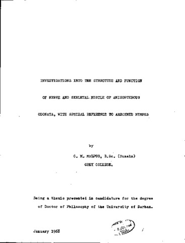 Investigations into the structure and function of nerve and skeletal muscle of anisoptebous odonata, with special reference to aeschnid nymphs.