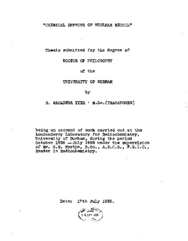 The investigations recorded in this thesis relate to a radiochemical study of the fates of iodine atoms recoiling after undergoing radiative neutron capture. Particular attention has been focussed upon mixtures of alkyl iodides, using the 'quasi-stable' fission product (^129)I (1.72 X l0(^7) y) to fix unequivocally the origin of the recoil iodine found in the products. Techniques have been developed for the synthesis of methyl and propyl iodides labelled with (^129)I on a micro-scale, and mixtures of these with unlabelled alkyl iodides have been irradiated in the Harwell reactor "BEPO". Other irradiations have been made with 14 MeV neutrons from the D+T reaction; with a Ra-ɤ-Be neutron source; and with a 100 curie (^60)Co source. Separation (by gas/liquid chromatography) and measurement techniques have also been perfected. From a study of the distribution of the active iodine between methyl and propyl iodides it seems that the recoiling atom is more likely to appear as methyl than as propyl iodide. In the case of (^130)I recoils this, ratio is about 3:1, for (^128)I it is about 1.8:1 and for (^126)I (produced by n,2n reaction) it is about 2.2:1. The results can only be explained if it is also assumed that about 10% of the neutron captures (in (^129)I) either do not result in bond rupture or lead to an immediate recombination with the residue of the parent molecule. The effect of ɤ-radiation (unavoidably present in neutron irradiations) on the exchange of iodine between methyl and propyl iodides, has been studied with the aid of (^131)I, using a 100 curie (^60)Co source.