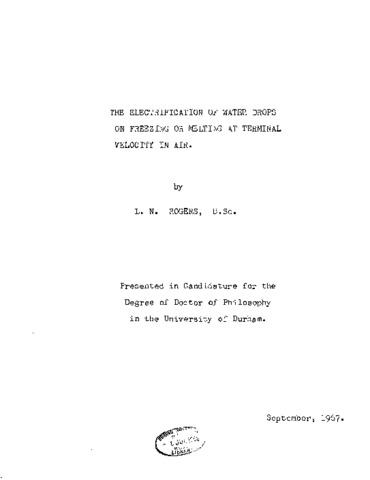 Measurements on the electrification on freezing of individual water drops of diameter between 3 and 5 mm supported by an air stream have shown that the freezing behaviour of the drops is temperature-dependent. Above -10 C the freezing progressed uniformly throughout the drop from a single point. Below -10 C the outer surface of the drop froze rapidly with the exception of a small area at the top of the drop. Freezing then progressed uniformly from the base of the drop upwards. Mo shattering or electrification of the drops was observed during their freezing. These results are contrasted with those of previous workers who observed the freezing of drops suspended on fibres. Measurements of the electrification of ice spheres supported by an air stream have indicated that the sign of the charge acquired by the spheres due to riming is temperature-dependent. When the sphere is rimed by droplets at temperatures above -10 C it acquires a negative charge, and v/hen the riming droplets are at temperatures below -10 C the ice sphere acquires a positive charge. An explanation is proposed for this effect in terms of the observed freezing behaviour of individual water drops. It I suggested that this effect could lead to thunderstorm electrification of the observed polarity. Measurements on the electrification of melting ice spheres supported by an air stream indicated that the sign of the charge acquired by the spheres is dependent on whether or not water is flung off the charge was negative. This may explain the discrepancies between the laboratory and field measurements of MacCready and Proudfit.