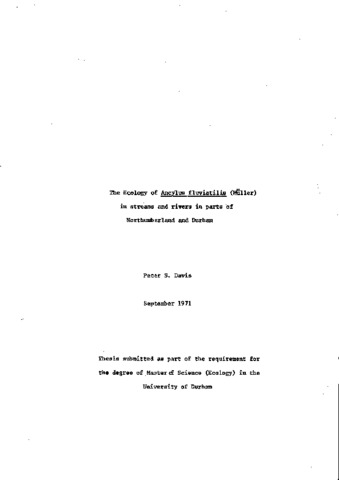 The ecology of ancylus fluviatilis (műller) in streams and rivers in parts of Northumberland and Durham.