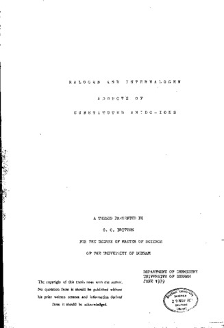 The reaction between N-dimethylchloramine and iodomethane - which yields the species (CH(_3))(_4)N(^+)(CH(_3))(_2)N(IC1)(_2)(^-) - has been investigated with a view to elucidating possible mechanisms, and a number of analagoua and related compounds have been prepared. Variation of initial molar ratios gives rise to different products and ratios of products. A large excess of N-dimethyl chloramine yields a mixture of (CH(_3))(_3)N.IC1 and (CH(_3))(_4)N(^+)(CH(_3))(_2)N(IC1)(_2)(^-) (1:1.55) whereas a one hundredfold excess of iodomethane yields iodine only. With nearly equal of starting materials, (CH(_3))(_4)N(^+)I(^-) is formed. These results suggest a number of competing reactions which became more or less favourable depending on initial reactant concentrations. A proposed mechanism for the reaction leading to the formation of(CH(_3))(_4)N(^+)(CH(_3))(_2)N(IC1)(_2)(^-) has been suggested: (i) (CH(_3))(_2)NC1 + CH(_3)I → (CH(_3))(_3)NC1I (ii) (CH(_3))(_3)NC1I → (CH(_3))(_3)N + IC1 (iii) CH(_3))(_3)N + (CH(_3))(_4)N(^+) I(^-) (iv) (CH(_3))(_2)NC1 + IC1 → (CH(_3))(_2) – Cl →IC1 (v) (CH(_3))(_2) – Cl → IC1 + (CH(_3))(_4)N(^+)I^-) → (CH(_3))(_4)N(^+) (CH(_3))(_2)N(IC1)(_2)(^-) The adduct (CH(_3))(_2)NC1.IC1 is a proposed intermediate, and this substance has been prepared, together with two other previously unknown related compounds (CH(_3))(_2)NC1.IBr and (CH(_3))(_2)NC1.Br(_2). The analogous N-dibenzylchloramine compound (C(_6)H(_5)CH(_2))(_2)NC1.IC1 has also been prepared. Various adducts of N-halami es have been reacted with arge cation halides. he reaction between (CH(_3)0(_2)NC1.IC1 and (CH(_3))(_4)N(^+)I(^-) yields (CH(_3))(_4)N(^+) (CH(_3))(_2)N (IC1)(_2)(^-) , and analogous reactions have produced the now compounds Cs(^+)(CH(_3))N(IC1)(_2)(^-), (C(_6)H(_5))(-2)I(^+)(CH(_3))(_2)N(IC1)(_2)(^-). Attempts to synthesise these and related compounds from N-halamine adducts and large cation tri-iodides have yielded the novel T1(^+) (CH(_3))(_2)N(IC1)(_2)(^-) besides providing a faster route to (CH(_3)(_4)N(^+)(CH(_3))(_2)N(IC1)(_2)(^-) and (CH(_3))(_4)N(^+)(CH(_3))(_2)NI(_4)(^=). A number of halide insertion reactions have been tried and have been shown to produce simple polyhalides or polyhalide mixtures in the majority of cases. Reaction of (CH(_3))(_2)NC1.J(_)2) with (CH(_3))(_4)N(^+)Br(^-) yielded the new substance (CH(_3)(_4)N(^+)(CH(_3))(_2)NIBrCl(_2)(^-), while with (CH(_3))(_4)N(^+)I(^I), the similarly novel (CH(_3)(_4)N(^+)(CH(_3)(_2)NI(_3)Cl(^-) is formed. Reaction of N-dimethyliodamine with iodomethane gives excellent yields of (CH(_3))(_4)N(^+)(CH(_3))(_2)NI(_4)(^-), but various attempts to alkylate N-halamines with allyl iodide failed. Benzyl iodide, on the other hand, produced complex mixtures or simple polyhalides, one such being (CH(_6)H(_5)CH(_2))(_2) (CH(_3))(_2)N(^+)I(_3)(^-) which does not appear to have been previously reported.