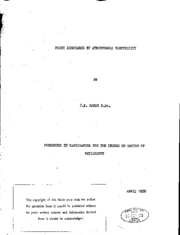 Investigations of the potential gradient beneath the ion stream liberated in point discharge in the atmosphere are described. The electrostatic effects of the ions are analysed theoretically and the results of simultaneous measurements of the potential gradient on the upwind and downwind side of an artificial point, wind speed, wind direction and temperature gradient reported. It is concluded that for distances from the base of the point less than √3 h times the height of the point and excluding conditions of snow and very heavy rain the electro-static field of the ion stream can be computed on the assumption that the ions take up an infinite line distribution. These conclusions are then applied to measurements made on a line of trees at Durham University Observatory and around a sycamore tree at the Durham City Golf course. The results for the line of trees indicate a change in point discharge characteristic with season; for the sycamore tree the current down the tree was found to be less than 1μa for a potential gradient of + 7,000 V/m. The changes of characteristic with season might be correlated with the appearance of the leaves on the trees. The implications of these results are discussed with reference to the assessment of point discharge current density basedon the equivalence of an artificial point and tree of a similar height. It is concluded that this equivalence is not in general justified and that a more comprehensive study of a similar nature is required before a reliable estimate of mean point discharge current density can be obtained from measurements with artificial points.