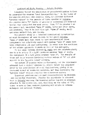 Valentine termed the phenomenon of post-fertilization failure in interspecific crosses “seed incompatibility.” On the basis of the results obtained from crossing them, he allotted different “genetic values” to the genomes of three species of Primula. The genetic ratio “R” (ratio of genomes of endosparm and maternal tissue) was calculated for each cross. When “R” is greater than the normal 1.5, so-called “type B” seeds, large and often empty, are produced. When R is less than 1.5, “type A” seeds, small and often well-filled, are formed. The present study is a detailed histological investigation of seed development of some crosses in the genus Primula. “type A” seeds have been shown to have overdeveloped inner integuments but relatively normal endosperms; “type B” seeds have thin integuments and poor endosperms. In every case the condition of the embryo apparently depends on that of the endosperm. In the cross between diploid P.Veris and its autotetraploid, the 4n x 2n mating (R = 1,25) produces extreme “type A” seeds, the reciprocal (R = 2.0) gives extreme “type B”. The results of these and other crosses involving various values of “R” all give support to the “genetic value” concept. The nature of genetic value is discusses, and the hypothesis advanced that a diploid species may evolve toward the polyploidy state by the accumulation of small duplications, giving it an increased amount of chromatic material, and thus increasing the “genetic value” without changing the chromosome number. Important previous work on seed incompatibility is reviewed and critically discussed. Finally the hypothesis is reviewed and critically discussed. Finally the hypothesis is advanced that in Primila crosses, the incoming pollen imparts an abnormal stimulus to the embryo sac, and, depending on the value of “R”, there is more or less serious physiological unbalance between endosperm and maternal tissues.