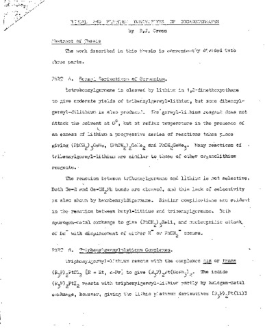 The work described in this thesis is conveniently divided into three parts. PART A. Benzyl Derivatives of Germanium. Tetrabenzylgermane is cleaved by lithium in 1,2-dimethoxyethane to give moderate yields of tribenzylgermyl-lithium, but some dibenzyl-gerrnyl-dilithium is also produced. The germyl-lithium reagent does not attack the solvent at 0 , but at reflux temperature in the presence of an excess of lithium a progressive series of reactions takes place giving (PhCH(_2))(_3)GeMe, (PhCH(_2))(_2)GeMe(_2) and PhCH(_2)GeMe(_3). Many reactions of tribenzylgermyl-lithium are similar to those of other organolithium reagents. The reaction between tribenzylgermane and lithium is not selective. Both Ge-H and Ge-CH(_2)Ph bonds are cleaved, and this lack of selectivity is also shown by hexabenzyldigermane. Similar complications are evident in the reaction between butyl-lithium and tribenzylgermane. Both hydrogen-metal exchange to give (PhCH(_2))(_3)GeLi, and nucleophilic attack of Bu(^-) with displacement of either H(^-) or PhCH(_2)(^-) occurs. PART B. Triphenylgermylplatinum Complexes. Triphenylgermyl-lithium reacts with the complexes cis or trans (R(_3)P)(_2)PtCl(_2) [R = Et, n-Pr] to give (R(_3)P)(_2)Pt(GePh(_3))(_2). The iodide (R(_3)P)(_2)PtI(_2) reacts with triphenylgermyl-lithium partly by halogen-metal exchange, however, giving the lithio platinum derivatives (R(_3)P)(_2)Pt(Li) I and (R(_3)P)(_2)Pt(Li)GePh(_3). The complexes (R(_3)P)(_2) Pt(GePh(_3))(_2) are stable to air and water but decompose at 150 with cleavage of Ge-Pt, Ge-C and P-C bonds. Iodine, HCl, MeI, NgI(_2), C(_2)H(_4)Br(_2), PhLi and LiAlH(_4) all cleave both Ge-Pt bonds, and in some cases at least the reaction probably proceeds via platinum(IV) intermediates. Hydrogenolysis of one Ge-Pt bond takes place under extremely mild conditions, and this may also proceed via oxidation to a Pt(IV) complex. Stable alkoxy-platinum complexes, (R(_3)P)(_2)Pt(OR')GePh(_3), were produced by the action of alcohols on the intermediate (R(_3)P)(_2)Pt(I)GePh(_3). PART C. Infrared Spectra. Characteristic infrared frequencies are given for 90 organogermanes, including alkyls, aryls, hydrides, deuterides, halides and oxides, with the main object of assisting characterisation of similar compounds. Germanium-carbon stretching frequencies for trans and gauche forms of n-butylgermanes have been observed.