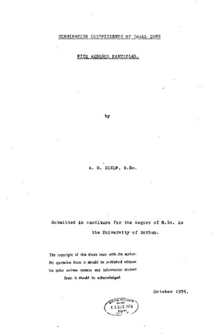 This work was concerned with the measurement of the variation of the combination coefficient between aerosol particles and small ions, b, with the radius of the particles. The variation of the combination coefficient between uncharged aerosol particles and small ions, ɳo, with radius was also examined. The ion-ion recombination coefficient,ɤ, was first evaluated from plots of small ion decay in an aerosol-free mylar vessel of volume 3.1 m(^3). Small ions were produced from corona discharge around the tip of a steel needle, set at a high voltage. 14 measurements of were made, giving a mean experimental value of 2.39 (-0.14) x l0(^-6)cm(^3)sec(^-l). A technique was developed for simultaneous measurements of the ,combination coefficient b and the aerosol particle size. Particles were produced by blowing filtered air over a glowing nichrome wire. Methods of number concentration and particle size determination are described. The decay of the ions in the presence of the particles in the mylar vessel was recorded and compared with a family of theoretical ion-aerosol decay curves plotted by the computer to determine b. A total of 26 b measurements were made and the value ranged from 0.35 x 10(^-6)cm(^3)sec(^-1) to 2.24 x 10(^-6)cm(^3)sec(^-1),corresponding to radii of 0.41 x 10(^-6)cm to 4.0 x 10(^-6) cm. The variation of ɳo with radius was also investigated in ten of these b measurement experiments. The value of ɳo ranged from 0.33 x l0(^-6)cm(^3)sec(^-1) to 2.39 x l0(^-6)cm(^3)sec(^-1) for corresponding radii of 1.26 x l0(^-6)cm and 4.0 x 10(^-6)cm. Various theoretical models for combination coefficients were discussed. The b and ɳo versus radius results were compared with theoretically computed values. The discrepancy between the generally larger experimental values and theoretical values for the combination coefficients was also discussed.