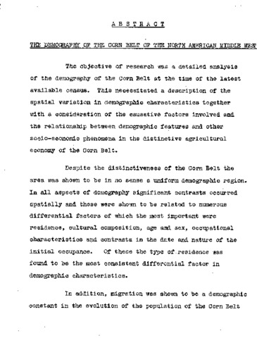 The objective of research was a detailed analysis of the demography of the Corn Belt at the time of the latest available census. This necessitated a description of the spatial variation in demographic characteristics together with a consideration of the causative factors involved and the relationship between demographic features and other socio-economic phenomena in the distinctive agricultural economy of the Corn Belt. Despite the distinctiveness of the Corn Belt the area was shown to be in no sense a uniform demographic region. In all aspects of demography significant contrasts occurred spatially and these were shown to be related to numerous differential factors of which the most important were residence, cultural composition, age and sex, occupational characteristics and contrasts in the date and nature of the initial occupance. Of these the type of residence was found to be the most consistent differential factor in demographic characteristics. In addition, migration was shown to be a demographic constant in the evolution of the population of the Corn Belt and in particular was a vital factor in the development of the present complex pattern of distribution and density. The latter was shown to be a composite structure in which an irregular urban and suburban distribution was super imposed on a relatively uniform distribution of rural population composed of the agricultural labour force and rural service centres. The evolution of this composite pattern was related to the differential growth of urban and rural population and involved considerable redistribution by internal migration. The result has been a concentration of the majority of the population in urban centres in activities unrelated directly to the agricultural economy, while in the basic rural distribution rural depopulation was shown to have regional significance.