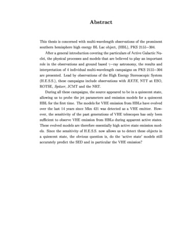 This thesis is concerned with multi-wavelength observations of the prominent southern hemisphere high energy BL Lac object, (HBL), PKS 2155-304. After a general introduction covering the particulars of Active Galactic Nuclei, the pysical processes and models that are believed to play an important role in the observations and ground based γ-ray astronomy, the results and interpretation of four individual multi-wavelength campaigns on PKS 2155-304 are presented. Lead by observations of the High Energy Stereoscopic System (H.E.S.S.), these campaigns include observations with RXTE, NTT at ESO, ROTSE, Spitzer, JCMT and the NRT. During all these campaigns, the source appeared to be in a quiescent state, allowing us to probe the jet paramaters and emission models for a quiescent HBL for the first time. The models for VHE emission from HBLs have evolved over the last 14 years since Mkn 421 was detected as a VHE emitter. However, the sensitivity of the past generations of VHE telescopes has only been sufficient to observe VHE emission from HBLs during apparent active states. These evolved models are therefore essentially high active state emission models. Since the sensitivity of H.E.S.S. now allows us to detect these objects in a quiescent state , the obvious question is, do the 'active state' models still accurately predict the SED and in particular the VHE emission?