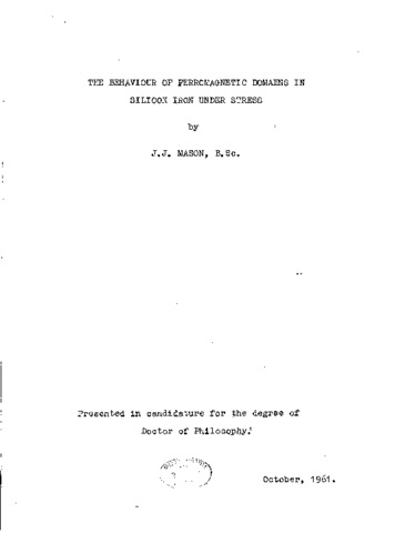 Polycrystalline and single crystal specimens of silicon iron were strained up to the yield point by the application of external stresses. A tending technique was found to be the most convenient method for doing this. Domain patterns were observed by means of the Bitter technique. Tensional stresses were applied along the [110] and 001] directions of (110) surfaced specimens and the result ing structures described in detail. This necessitated an analysis of the effect of stress on Bloch Wall energies for various wall orientations. Domain patterns were also examined on (100) surfaced specimens under the effect of compressive forces in the [110] and [100] directions. In the first case the maze patterns so produced were compared with theoretical considerations while in the second example the nucleation and growth of transverse domains were examined. A new model of fir tree structures, proposed by Spacek, was evaluated using a different expression for the magnetostatic energy and this was then applied to measurements on the effect of stress on fir tree closure domains. The theory did not compare very favourably with experiment. The work of Chikazumi and Suzulci, in which large stresses were applied to a (l00) surfaced specimen by scratching the surface, was extended to (110) surfaces.
