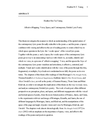 This thesis investigates the manner in which an understanding of the spatial nature of the contemporary lyric poem (broadly reducible to the poem as and the poem of space) combines with voicing and affect in the act of reading poetry to create a third way in which space operates in the lyric: the ‘vocalic space’ of the voiced lyric poem. Together with the poem as and of space, the vocalic space of the contemporary lyric poem gives way to an enunciating I and eye with which we, as reader, identify and which we voice, in a process of ‘affective mapping’. Voice, and the spaces the I/eye of the contemporary lyric poem visualises and articulates, is affective, contested, and multiple. Visual and vocalic identification with the voice of the poem through this free, fragmented, or multiple, I/eye leads us to understand more fully the poem on its own terms. The chapters of this thesis offer readings of John Montague’s The Rough Field, Thomas Kinsella’s A Technical Supplement, Kathleen Jamie’s This Weird Estate, and Alice Oswald’s Dart, as well as the poetry of Seamus Heaney, Thom Gunn and Mimi Khalvati, in order to investigate the implication of this thesis on the way we read, voice, and analyse contemporary British lyric poetry. The work of each poet offers different perspectives on perception, place, and space, and different engagements with the voiced and textual spaces of poetry, from the more formal poetics of Heaney, Jamie, and Gunn, to the experiments with text and image of Montague, Kinsella, and Jamie, the use of different languages by Montague, Jamie, and Khalvati, and the manipulation of the space of the page and angle of poetic vision and voice by Montague, Khalvati, and Oswald. The chapters work almost chronologically from The Rough Field (1972) to Dart (2002) with an emphasis on the importance of space, voice, and affect to the readings of the poems and poets in question.