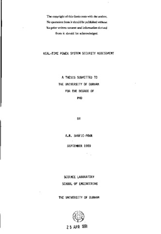 The increasing complexity of modern power systems has led to a greater dependence on automatic control at all levels of operation. Large scale systems of which a power system is a prime example, is an area in which a wide gap exists between theoretical mathematically based research and engineering practice. The research programme at Durham is directed towards bridging this gap by linking some of the available and new theoretical techniques with the practical requirements of on-line computer control in power systems. This thesis is concerned with the assessment of security of power systems in real-time operation. The main objective of this work was to develop a package to be incorporated in the University of Durham On line Control of Electrical Power Systems (OCEPS) suite to cater for network islanding and analyse the features and the feasibility of a real-time 'security package’ for modern energy control centres. The real-time power systems simulator developed at Durham was used to test the algorithms and numerical results obtained are presented.