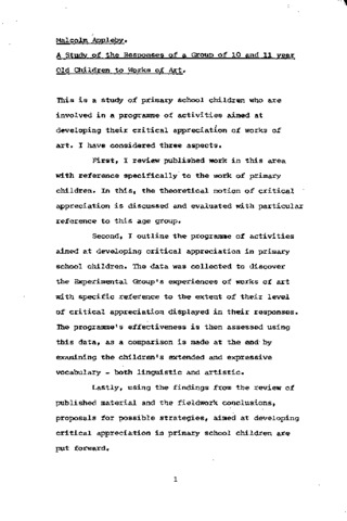 This is a study of primary school children who are involved in a programme of activities aimed at developing their critical appreciation of works of art. I have considered three aspects. First, I review published work in this area with reference specifically to the work of primary children. In this, the theoretical notion of critical appreciation is discussed and evaluated with particular reference to this age group. Second, I outline the programme of activities aimed at developing critical appreciation in primary school children. The data was collected to discover the Experimental Group's experiences of works of art with specific reference to the extent of their level of critical appreciation displayed in their responses. The programme's effectiveness is then assessed using this data, as a comparison is made at the end by examining the children's extended and expressive vocabulary - both linguistic and artistic. Lastly, using the findings from the review of published material and the fieldwork conclusions, proposals for possible strategies, aimed at developing critical appreciation in primary school children are put forward.