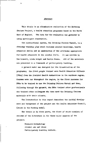 This thesis is an illuminative evaluation of the Drinking Choices Project, a health education programme based in the North East of England. The data for the evaluation was gathered by using participant observation. The instructional system, the Drinking Choices Manual, is a five-day teaching plan which includes alcohol knowledge, health education skills and an examination of the attitudes appropriate for health educators in the alcohol field. It was written by Ina Simnett, Linda Wright and Martin Evans. All of the materials are presented in a framework of participatory learning. A pyramid model was designed for the dissemination of the programme; the first people trained were Health Education Officers (HEOs) from the District Health Authorities in the northern region. Courses were run throughout the region, in the first instance for HEOs to be trained to use the Drinking Choices Manual and then, following through the pyramid, the HEOs trained other professionals who trained other colleagues who then used the Drinking Choices materials with their clients. The Introduction to this report describes the initial development and background of the project and the Health Education Council, (which is the Funding body).The thesis is in three parts, the first of which consists of reviews of the literature in the three major aspects of the project: Research Methodology Alcohol use and abuse Participatory learning methods. The second part begins with a description of the culture of the HBO so as to understand the organisational system in which the innovation took place; then the progress through the pyramid of dissemination is described, along with a detailed examination of the Manual itself and an investigation into obstacles encountered in implementing the Project. Part III examines positive aspects of the project, including a variety of outcomes and spin-offs which resulted. In Chapters VIII and IX conclusions and recommendations are presented; in Chapter X, which was written six months after the project ended, the Steps to Successful Change are outlined, followed by an epilogue, appendices, and bibliography.