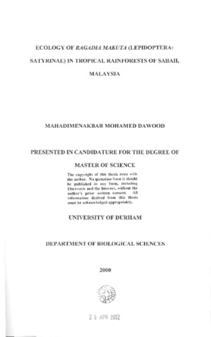 Ecology of ragadia makuta (lepidoptera: satyrinae) in tropical rainforests of Sabah, Malaysia.