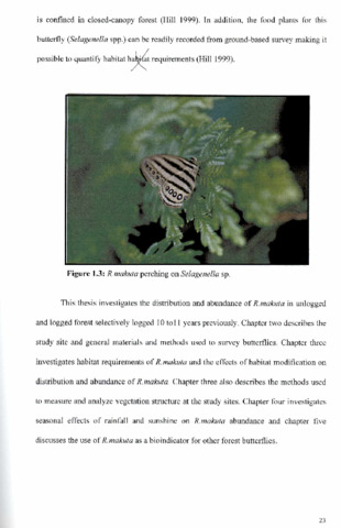 The satyrid butterfly Ragadia makuta Horsfield was studied in lowland dipterocarp rainforest in Sabah, Borneo. Data were collected monthly from March 1999 to February 2000 in two habitat types, unlogged forest and forest that had been selectively logged 10 to 11 years previously. THe primary aim was to investigate the effects of selective logging on R. makuta abundance and distribution. Transect walk-and-count and point sampling techniques were used to record satyrinae, morphinae and riodinidae butterflies plus one species of Danaidae (Idea stolli). Butterflies were sampled at 80 observation stations along 8 km of transects in logged and unlogged forests. Measurements of vegetation structure showed that effects of logging were still evident 10 years after logging. Logged forests had lower canopy and understorey cover and fewer large trees but a larger proportion of pioneer Macarangga spp. compared with unlogged forest. R. makuta abundance was not affected by selective logging. Habitat requirements of R. makuta were investigated and in both unlogged and logged forests, R. makuta was more abundant in areas with greater cover of its larval host plant (Selegenella spp). There was some evidence for R. makuta changing its habitat requirements from unlogged forest to logged forest but these changes were relatively small. The distribution and abundance of R. makuta varied from month to month in relation to rainfall. Rainfall one month before surveys was negatively correlated with R. Makuta abundance. This indicates that rainfall may affect adult abundance through its impacts on larval development and survival. The use of R. Makuta as biodiversity indicator for other butterflies was examined. R. makuta abundance was positively correlated with diversity of other satyrid and rionidid butterflies. This suggested that R. makuta could be used as indicator of other understorey butterflies and that R. Makuta may be an important tool for conservation studies.