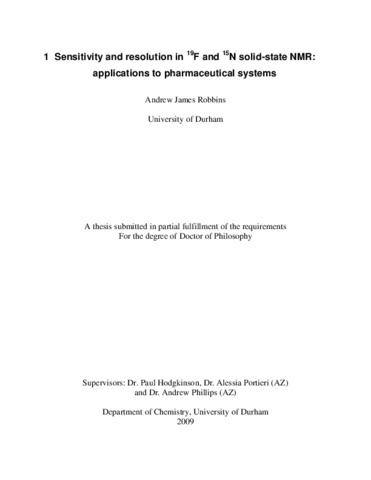 This thesis describes a study into the improvement of solid-state NMR methods for the detection and characterisation of pharmaceutical compound. Chapter 1 reviews the literature that are relevant to the techniques discussed within this thesis Chapter 2 outlines the key experimental techniques employed within this work. Chapter 3 investigates the usefulness of indirect detection as a method to detect and possibly quantify the ratio of 15N present for multiple 15N containing systems. The work highlights how for CP performed at fast MAS, there is a much greater sensitivity to the RF inhomogeneity of the probe, and how this be reduced by using ramped CP. The results showed that for routine detection of 15N it is advised to detect via routine CP, due to the more complex setup of indirect detection. Chapter 4 discusses the potential of combining REDOR data and that of powder X-ray diffraction as a method to improve the efficiency of structural determination of powders. The investigation was performed on two pseudo-polymorphs with the aim of measuring differences in the 13C-19F couplings. The aim was that many ‘loose constraints’ could be used to improve efficiency when working with natural abundance 13C. Chapter 5 for 19F, a large number of model compounds were selected to reflect the broad range of possible fluorine environments, ranging from per-fluorinated systems where the line-width is dominated by homonuclear coupling to systems dilute in 19F when the total line-width is found to be determined by the hetero-nuclear decoupling as well as in-homogenous contribution. Combining the data from the model compounds it has led to a better understanding the factors that determine 19F resolution. As such a suitable work scheme in order to achieve the best resolution for 19F containing compounds is presented. Chapter 6 investigates the combination of NMR and calculated data in order to assign chemical shifts to specific crystal sites1. The results show that by combining ab initio calculations with 2D NMR data confident assignment of peaks is possible. (1) Robbins, A. J.; Ng, W. T. K.; Jochym, D.; Keal, T. W.; Clark, S. J.; Tozer, D. J.; Hodgkinson, P. Phys. Chem. Chem. Phys. 2007, 9, 2389.
