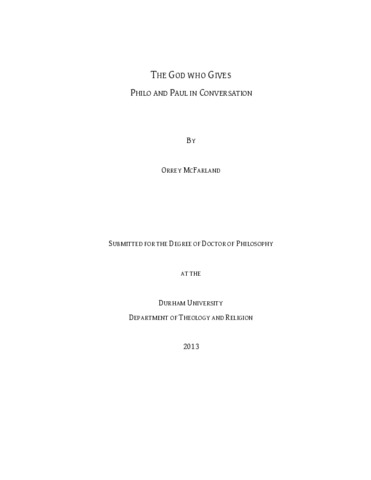 This thesis sets Philo of Alexandria and the apostle Paul in conversation on divine grace. While scholars have occasionally observed that Philo and Paul both speak about God’s generosity, studies and comparisons of their particular theologies of grace have been rare. And such work has often placed Philo and Paul in either strong continuity or stark discontinuity without probing into the theological logic that animates the particularities of their thought. By contrast, this work argues that Philo and Paul both could speak of divine gifts emphatically and in formally similar ways while making materially different theological judgments. That is, their theologies of grace are neither identical nor antithetical. Part One sets forth Philo’s view of divine generosity. Chapter One explores Philo’s doctrine of God, considering how the different aspects of his Theology proper relate and contribute to his belief that God is a lover of gifts and giving. Chapter Two focuses on what kind of human is worthy to receive divine gifts and what constitutes a human as worthy. It is argued throughout that Philo’s concept of both God’s generosity and human worth must be situated within the context of God’s creative acts: human worth is constituted by the God who creates all good things, and God’s giving is rational and just, in line with the patterns of the cosmos established by God’s Law and Logos. Part Two turns to Paul, placing portions of his letters in dialogue with Philo. Chapter Three traces how Paul’s view of divine grace is concentrated in and explicated by the Christ-event; Chapter Four explores how the gift is given and received, with a focus on the apostle’s role; and Chapter Five examines the relationship between divine and human generosity within community. The main consequence of the comparison in Part Two is the conclusion that Philo’s and Paul’s beliefs about divine grace are both emphatic and different, and the relationship between them is interesting because of that fact. Philo’s theology stresses that in creation God is revealed to be abundantly gracious to humans who should live virtuously through the use of God’s creational gifts. Paul’s theology stresses that the divine act of Jesus’ death and resurrection for the ungodly, which effects new creation, is the supreme manifestation of divine generosity.