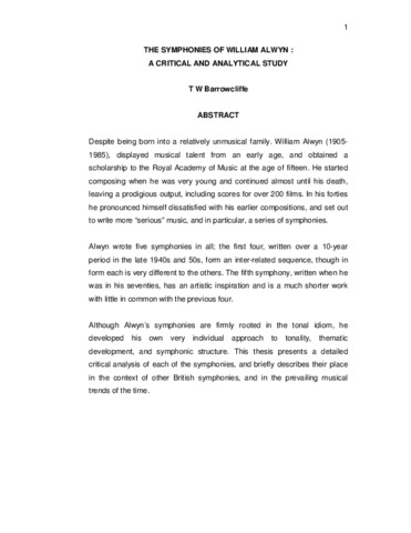 Despite being born into a relatively unmusical family. William Alwyn (1905-1985), displayed musical talent from an early age, and obtained a scholarship to the Royal Academy of Music at the age of fifteen. He started composing when he was very young and continued almost until his death, leaving a prodigious output, including scores for over 200 films. In his forties he pronounced himself dissatisfied with his earlier compositions, and set out to write more “serious” music, and in particular, a series of symphonies. Alwyn wrote five symphonies in all; the first four, written over a 10-year period in the late 1940s and 50s, form an inter-related sequence, though in form each is very different to the others. The fifth symphony, written when he was in his seventies, has an artistic inspiration and is a much shorter work with little in common with the previous four. Although Alwyn’s symphonies are firmly rooted in the tonal idiom, he developed his own very individual approach to tonality, thematic development, and symphonic structure. This thesis presents a detailed critical analysis of each of the symphonies, and briefly describes their place in the context of other British symphonies, and in the prevailing musical trends of the time.