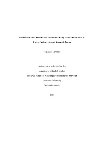 This thesis investigates the impact of German ideas of ‘romantic drama’ on Shelley’s dramatic conceptions. Taking his reading of August Wilhelm Schlegel’s Lectures on Dramatic Art and Literature in March 1818 as its starting point and fundamental basis, it begins by outlining the concept of ‘romantic drama’ that Shelley encountered in Schlegel and traces its subsequent influence on Shelley’s dramas and theoretical prose. In contrast to previous studies of Shelley’s readings of Goethe and Calderón, which focused on common themes such as the nature of evil, I argue that his interest in these writers can first and foremost be understood in the context of his attempts at forming a new drama. Together with Shakespeare, Calderón was the main representative of ‘romantic drama’ for Schlegel, and Goethe’s reaction to the Spaniard paralleled Shelley’s. A chapter on Shelley’s reading of Calderón will demonstrate the scope of his engagment with the Golden Age dramatist, while chapters on his Spanish excerpts and his translations from El mágico prodigioso and Faust will elucidate the English poet’s understanding of Calderón’s and Goethe’s dramatic art and intentions. After analyzing The Cenci, Prometheus Unbound, and Charles the First, the thesis will close with a chapter on Hellas which demonstrates how Shelley draws together the dramatic elements and ideas he had encountered in Schlegel, Calderón, and Goethe. This second lyrical drama represents the epitome of his engagement with these European writers.