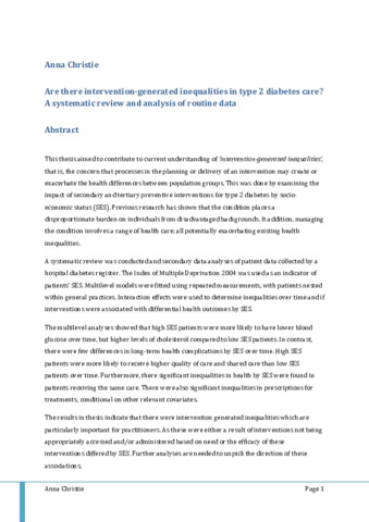 This thesis aimed to contribute to current understanding of ‘intervention-generated inequalities’, that is, the concern that processes in the planning or delivery of an intervention may create or exacerbate the health differences between population groups. This was done by examining the impact of secondary and tertiary preventive interventions for type 2 diabetes by socio-economic status (SES). Previous research has shown that the condition places a disproportionate burden on individuals from disadvantaged backgrounds. It addition, managing the condition involves a range of health care; all potentially exacerbating existing health inequalities. A systematic review was conducted and secondary data analyses of patient data collected by a hospital diabetes register. The Index of Multiple Deprivation 2004 was used as an indicator of patients’ SES. Multilevel models were fitted using repeated measurements, with patients nested within general practices. Interaction effects were used to determine inequalities over time and if interventions were associated with differential health outcomes by SES. The multilevel analyses showed that high SES patients were more likely to have lower blood glucose over time, but higher levels of cholesterol compared to low SES patients. In contrast, there were few differences in long-term health complications by SES over time. High SES patients were more likely to receive higher quality of care and shared care than low SES patients over time. Furthermore, there significant inequalities in health by SES were found in patients receiving the same care. There were also significant inequalities in prescriptions for treatments, conditional on other relevant covariates. The results in thesis indicate that there were intervention generated inequalities which are particularly important for practitioners. As these were either a result of interventions not being appropriately accessed and/or administered based on need or the efficacy of these interventions differed by SES. Further analyses are needed to unpick the direction of these associations.