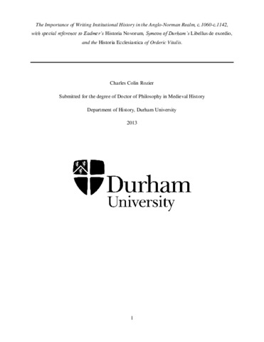 The Importance of Writing Institutional History in the Anglo-Norman Realm, c.1060-c.1142, with special reference to Eadmer’s Historia Novorum, Symeon of Durham’s Libellus de exordio, and the Historia Ecclesiastica of Orderic Vitalis.