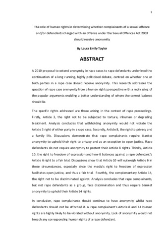 A 2010 proposal to extend anonymity in rape cases to rape defendants underlined the continuation of a long running, highly politicised debate, centred on whether one or both parties in a rape case should receive anonymity. This research addresses the question of rape case anonymity from a human rights perspective with a rephrasing of the popular arguments enabling a better understanding of where the correct balance should lie. The specific rights addressed are those arising in the context of rape proceedings. Firstly, Article 3, the right not to be subjected to torture, inhuman or degrading treatment. Analysis concludes that withholding anonymity would not violate the Article 3 right of either party in a rape case. Secondly, Article 8, the right to privacy and a family life. Discussions demonstrate that rape complainants require blanket anonymity to uphold their right to privacy and as an exception to open justice. Rape defendants do not require anonymity to protect their Article 8 rights. Thirdly, Article 10, the right to freedom of expression and how it balances against a rape defendant’s Article 6 right to a fair trial. Discussions show that Article 10 will outweigh Article 6 in these circumstances, especially since the media’s right to freedom of expression facilitates open justice, and thus a fair trial. Fourthly, the complementary Article 14, the right not to be discriminated against. Analysis concludes that rape complainants, but not rape defendants as a group, face discrimination and thus require blanket anonymity to uphold their Article 14 rights. In conclusion, rape complainants should continue to have anonymity whilst rape defendants should not be afforded it. A rape complainant’s Article 8 and 14 human rights are highly likely to be violated without anonymity. Lack of anonymity would not breach any corresponding human rights of a rape defendant.