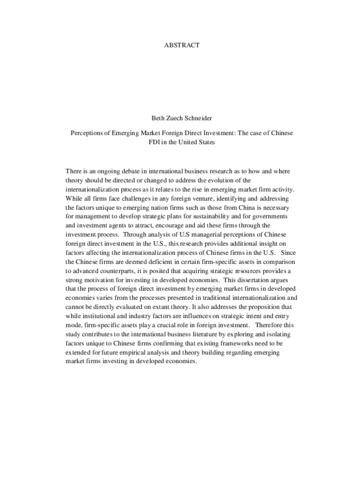 There is an ongoing debate in international business research as to how and where theory should be directed or changed to address the evolution of the internationalization process as it relates to the rise in emerging market firm activity. While all firms face challenges in any foreign venture, identifying and addressing the factors unique to emerging nation firms such as those from China is necessary for management to develop strategic plans for sustainability and for governments and investment agents to attract, encourage and aid these firms through the investment process. Through analysis of U.S managerial perceptions of Chinese foreign direct investment in the U.S., this research provides additional insight on factors affecting the internationalization process of Chinese firms in the U.S. Since the Chinese firms are deemed deficient in certain firm-specific assets in comparison to advanced counterparts, it is posited that acquiring strategic resources provides a strong motivation for investing in developed economies. This dissertation argues that the process of foreign direct investment by emerging market firms in developed economies varies from the processes presented in traditional internationalization and cannot be directly evaluated on extant theory. It also addresses the proposition that while institutional and industry factors are influences on strategic intent and entry mode, firm-specific assets play a crucial role in foreign investment. Therefore this study contributes to the international business literature by exploring and isolating factors unique to Chinese firms confirming that existing frameworks need to be extended for future empirical analysis and theory building regarding emerging market firms investing in developed economies.