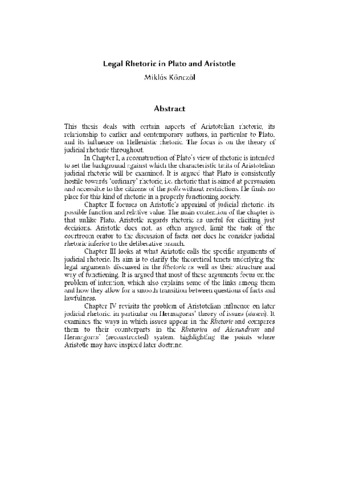 This thesis deals with certain aspects of Aristotelian rhetoric, its relationship to earlier and contemporary authors, in particular to Plato, and its influence on Hellenistic rhetoric. The focus is on the theory of judicial rhetoric throughout. In Chapter I, a reconstruction of Plato’s view of rhetoric is intended to set the background against which the characteristic traits of Aristotelian judicial rhetoric will be examined. It is argued that Plato is consistently hostile towards ‘ordinary’ rhetoric, i.e. rhetoric that is aimed at persuasion and accessible to the citizens of the polis without restrictions. He finds no place for this kind of rhetoric in a properly functioning society. Chapter II focuses on Aristotle’s appraisal of judicial rhetoric: its possible function and relative value. The main contention of the chapter is that unlike Plato, Aristotle regards rhetoric as useful for eliciting just decisions. Aristotle does not, as often argued, limit the task of the courtroom orator to the discussion of facts, nor does he consider judicial rhetoric inferior to the deliberative branch. Chapter III looks at what Aristotle calls the specific arguments of judicial rhetoric. Its aim is to clarify the theoretical tenets underlying the legal arguments discussed in the Rhetoric as well as their structure and way of functioning. It is argued that most of these arguments focus on the problem of intention, which also explains some of the links among them and how they allow for a smooth transition between questions of facts and lawfulness. Chapter IV revisits the problem of Aristotelian influence on later judicial rhetoric, in particular on Hermagoras’ theory of issues (staseis). It examines the ways in which issues appear in the Rhetoric and compares them to their counterparts in the Rhetorica ad Alexandrum and Hermagoras’ (reconstructed) system, highlighting the points where Aristotle may have inspired later doctrine.