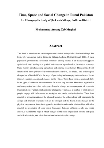 This thesis is a study of the social organisation of time and space in a Pakistani village. The fieldwork was carried out in Jhokwala Village, Lodhran District through 2010. A rapid population growth in the second half of the last century resulted in an inadequate supply of agricultural land, leading to a gradual shift from an agricultural to the market economy. Many farmers are abandoning agriculture and entering wage labour. This combined with urbanisation, more pervasive telecommunication services, the media, and technological changes has affected shifts in the ways of perceiving and managing time and space. In this thesis, I examine generational changes in the village. There have been generational shifts in the types of calendars and the contexts for which they are used. Household organisation and composition have also undergone dramatic change as a consequence of economic transformations. Fundamental economic changes have included a number of shifts in how people engage with information technologies, the media, and urbanisation. These have resulted in a transformation of the physical layout of the village along with changes in the design and structure of places such as the mosque and the house. Such changes in the physical environment have also triggered a shift in the sociospatial relationships, which has resulted in negotiation of some social boundaries between different gender and social classes. I examine the ways in which changes in the social organisation of time and space are indicative of the pace, direction and mechanism of social change.