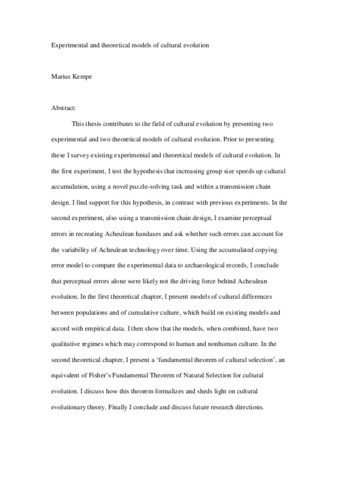 This thesis contributes to the field of cultural evolution by presenting two experimental and two theoretical models of cultural evolution. Prior to presenting these I survey existing experimental and theoretical models of cultural evolution. In the first experiment, I test the hypothesis that increasing group size speeds up cultural accumulation, using a novel puzzle-solving task and within a transmission chain design. I find support for this hypothesis, in contrast with previous experiments. In the second experiment, also using a transmission chain design, I examine perceptual errors in recreating Acheulean handaxes and ask whether such errors can account for the variability of Acheulean technology over time. Using the accumulated copying error model to compare the experimental data to archaeological records, I conclude that perceptual errors alone were likely not the driving force behind Acheulean evolution. In the first theoretical chapter, I present models of cultural differences between populations and of cumulative culture, which build on existing models and accord with empirical data. I then show that the models, when combined, have two qualitative regimes which may correspond to human and nonhuman culture. In the second theoretical chapter, I present a ‘fundamental theorem of cultural selection’, an equivalent of Fisher’s Fundamental Theorem of Natural Selection for cultural evolution. I discuss how this theorem formalizes and sheds light on cultural evolutionary theory. Finally I conclude and discuss future research directions.