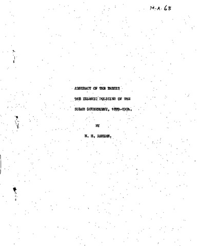 The present work intends to study the policy the Anglo-Egyptian rulers adopted towards Islam when their joint rule was established in the Sudan in 1899. The period covered by this study is extended from 1899 to 1924. Besides an introduction and the conclusion the main body of the work has been divided into six chapters. For convenience, each chapter has been sub-divided into sections. Giving a brief historical background leading to the establishment of the joint Anglo-Egyptian rule in the Sudan in 1899, the introduction introduces to the reader the prime necessity for adopting a policy of religious non-interference. It also indicates the Government intention to restore the orthodox Islam in the country. Chapter I dwells upon the Government policy towards the official institutions of the orthodox Islam – vis, the courts administering the Sharia Law and the public mosques. Along these it also throws light on the Government attitude towards the pilgrimage to Mecca and the chief Muslim religious festivals. Chapter II discusses the Government policy towards the traditional methods and institutions of education of the Sudanese Muslims, which in different ways represented orthodox Islam in the Sudan. Chapter III deals with the Sudanese religious brotherhoods, their origin, methods of organisation and their rituals. But more important, it, at the end, discusses the new Government’s policy toward these religious brotherhoods. Chapter IV casts light on the Government policy towards the Hahdists and their leader. It falls into two periods: one from 1899 to 1913 and the other 1914 to 1924. It discusses the policy on the basis of the four elements of Mahdism, vis, its doctrine; leader; sacred writings, objects and places; and its methods of organisation. Chapter V deals with the Government policy to protect the Muslim North form the influence of the Christian Missions. It also indicates the Government missionary policy vis a vis Islam in the Southern Sudan. It shows how the religious political ends. The Conclusion concludes with the explanation why the so called policy of religious non-interference was possible on the part of the British rulers. It also tries to bring to light the effects and impacts of twenty-five years of Anglo-Egyptian rule on the Sudanese Muslims.