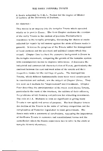 This thesis is an enquiry into the turnpike Trusts which operated wholly or in part in Essex. The first Chapter analyses the creation of the early Trusts in the context of previous Parliamentary resistance to the turnpike principle, discussing the choice of roads selected for repair by toll money against the state of Essex roads in general. It traces the progress of the Trusts under the management of local justices and the practical and political issues which this raised. Chapter Two is about the economic background in Essex to the turnpike movement, comparing the growth of the turnpike system with contemporary moves to improve waterways; it discusses the industrial and commercial characteristics of Essex, particularly the contrast between the east and west sides of the county and their respective routes for the carriage of goods. The metropolitan Trusts, which differed fundamentally from their rural counterparts in constitution and outlook, are the subject of Chapter Three. They are seen as a medium for 'improvement' and investment. Chapter Four describes the administration of the more rural Essex Trusts, particularly the work of the trustees, the calibre of their officers, the problems of toll farming and policies for attracting investment. The role of J. L. McAdam is seen as significant in giving many Trusts a new spirit and sense of purpose. The last Chapter traces the decline of the Trusts in the wake of railway competition and the complexities of Victorian legislation in local government. The thesis ends with a summary of conclusions, assessing the importance of the Essex Trusts in economic and constitutional terms and the contribution which the Essex experience has to offer to the study of turnpike history elsewhere.