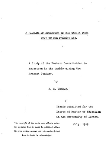 A history of education in the Gambia from 1901 to the present day: a study of the western contribution to education in the Gambia during the present century.