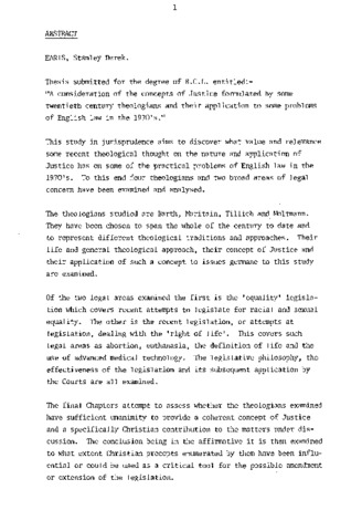 Thesis submitted for the degree of B.C.L. entitled:- "A consideration of the concepts of Justice formulated by some twentieth century theologians and their application to some problems of English law in the 1970's."This study in jurisprudence aims to discover what value and relevance some recent theological thought on the nature and application of Justice has on some of the practical problems of English law in the 1970's. To this end four theologians and two broad areas of legal concern have been examined and analysed. The theologians studied are Earth, Maritain, Tillich and Moltmann. They have been chosen to span the whole of the century to date and to represent different theological traditions and approaches. Their life and general theological approach, their concept of Justice and their application of such a concept to issues germane to this study are examined. Of the two legal areas examined the first is the 'equality' legislation which covers recent attempts to legislate for racial and sexual equality. The other is the recent legislation, or attempts at legislation, dealing with the 'right of life'. This covers such legal areas as abortion, euthanasia, the definition of life and the use of advanced medical technology. The legislative philosophy, the effectiveness of the legislation and its subsequent application by the Courts are all examined. The final Chapters attempt to assess whether the theologians examined have sufficient unanimity to provide a coherent concept of Justice and a specifically Christian contribution to the matters under discussion. The conclusion being in the affirmative it is then examined to what extent Christian precepts enumerated by them have been influential or could be used as a critical tool for the possible amendment or extension of the legislation.