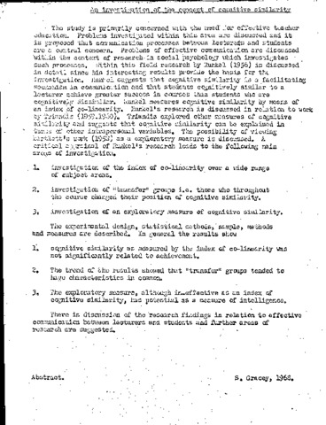 The study is primarily concerned with the need for effective teacher education. Problems investigated within this area are discusses and it is proposed that communication processes between lecturers and students are a central concern. Problems of effective communication are discussed within the context of research in social psychology which investigates such processes. Within this field research by Runkel (1956) is discussed in detail since his interesting results provide the basis for the investigation. Runkel suggests that cognitive similarity is a facilitating mechanism in communication and that students cognitively similar to a lecturer achieve greater success in courses that students who are cognitively dissimilar. Runkel measures cognitive similarity by means of an index of co-linearith. Runkel’s research is discussed in relation to work by Triandis (1959.1960). Triandis explored other measures of cognitive similarity and suggests that cognitive similarity can be explained in terms of other intrapersonal variables. The possibility of viewing Bartlett’s work (9158) as a exploratory measure is discussed. A critical appraisal of Runkel’s research leads to the following main areas of investigation. investigation of the index of co-linearity over a wide range of subject areas. investigation of “transfer” groups i.e. those who throughout the course changed their position of cognitive similarity. investigation of an exploratory measure of cognitive similarity. The experimental design, statistical methods, sample, methods and measures are described. In general the results showcognative similarity as measured by the index of co-linearity was not significantly related to achievement. The trend of the results showed that “transfer” groups tended to have characteristics in common. The exploratory measure, although in effective as an index of cognitive similarity, has potential as a measure of intelligence. There is discussion of the research findings in relation to effective communication between lecturers and students and further areas of research are suggested.