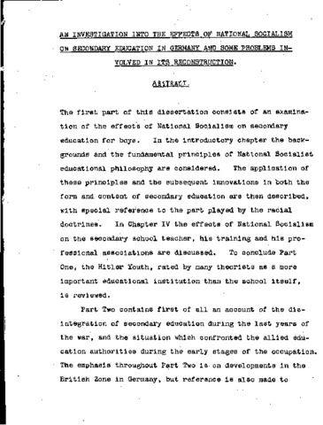 The first part of this dissertation consists of an examination of the effects of National Socialism on secondary education for boys. In the Introductory chapter the backgrounds and the fundamental principles of National Socialist educational philosophy are considered. The application of these principles and the subsequent innovations in both the form and content of secondary education are then described, with special reference to the part played by the racial doctrines. In Chapter IV the effects of National Socialism on the secondary school teacher, his training and his professional associations are discussed. To conclude Part One, the Hitler Youth, rated by many theorists as a more important educational institution than the school itself, is reviewed. Part Two contains first of all an account of the disintegration of secondary education during the last years of the war, and the situation which confronted the allied education authorities during the early stages of the occupation. The emphasis throughout Part Two is on developments in the British Zone in Germany, but reference is also made to educational tendencies noted in the other zones. Some of the divergent aims and methods pursued in the zones in the re-organisation of the form and content of secondary education along democratic lines are detailed in Chapter VII. In conclusion certain parallel lines of development in contemporary English and National Socialist educational thought have been included which point to the conclusion that the Nazi diagnosis was often correct but that the remedy applied was wholly false. Finally the conditions of and the prospects for education for democracy in Germany are discussed, which lead to the ultimate belief that unless the Western powers can rapidly provide some spiritual goal, the more dynamic, all-embracing totalitarian ideology of the Russians may in the end make more appeal to the Germans.