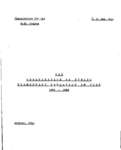 The period under review is divided into two halves, the dividing line being the year 1889, when the first York School Board was elected. Thus, the first part (1870 - 1888) is concerned purely with how Voluntary Schools provided elementary education in the city. It begins by showing how the provision of schools in 1870 was such that a School Board was not thought necessary, and how the Denominations increased the supply up to 1888. Much attention is given to the way in which these schools were financed, and to the difficulties which they met in raising sufficient funds. Chapter 3 deals with the problem of school attendance, describing in detail the measures taken by the School Attendance Committee, and the effect they had. The second part (1888 - 1902) opens by showing how a deficiency arose in accommodation, necessitating the formation of a School Board; the composition of that Board and subsequent ones is then summarised. In the next Chapter, details are given of how schools were provided, by both the School Board and Voluntary bodies, with some mention of alleged competition. Then follows a comparison of the way in which both types of school were financed, again underlining the difficulties of the Voluntary bodies and showing the advantage that lay with the School Board. Attention is then given to the continued activities of the School Attendance Committee, and the resulting success, to the gradual abolition of fees and to the raising of the school leaving age. The filial chapters deal more specifically with the activities of the School Board designed to widen the scope of education in York, including the introduction of scientific and practical subjects, evening schools, education of pupil-teachers and the beginning of recreational and educational visits. How some of these were affected by the Cockerton Judgment is also described. The dissertation concludes with an assessment of the work of the School Board and the Voluntary bodies, and notes the transfer of the whole system in 1903 to the new Education Committee,