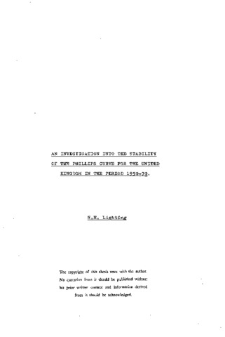 The study begins with a survey of some of the theoretical work on the wage-change equation, followed by a complementary summary of some of the empirical evidence on the determinants of wage inflation in the United Kingdom for the post war sample period. Estimates are then presented of the wage-change equation for the United Kingdom for the chosen (1950-70) sample period, using annual data, in order to explore the sensitivity of the results to the use of alternative wage- rate and unemployment series, and to the use of alternative definitions of the time rate of change variables. The main enquiry of the study centres on the use of the unemployment rate as an efficient proxy for the degree of excess demand for labour in the theory of the Phillips curve. It is possible that the observed instability of the curve may reflect the fact that the reported unemployment rate has become increasingly inefficient as such a proxy. An important source of error in the reported unemployment statistics is due to the non-registration by 'secondary' workers in the labour force. Estimates are presented of some 'adjusted' unemployment series which take into account the cyclical nature of this non-registration; and which are worked up from an analysis of participation rates in the United Kingdom. These estimates are carried over into an analysis of the 'mapping' from excess demand to unemployment where the objective is to identify and measure changes in the level of 'maladjustment' unemployment (the level associated with zero aggregate excess demand for labour). Estimates are obtained of maladjustment unemployment, and these are used to further correct the unemployment statistics for changes in 'maladjustment' unemployment. Finally this corrected unemployment series is incorporated in the aggregate wage-change equation to re-examine the statistical significance of the Phillips relation.