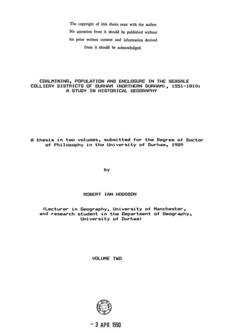 Coalmining, population and enclosure in the Seasale colliery districts of Durham (northern Durham), 1551-1810 : a study in historical geography.