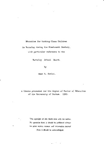 Education for working class children in Barnsley during the nineteenth century, with particular reference to the Barnsley school board